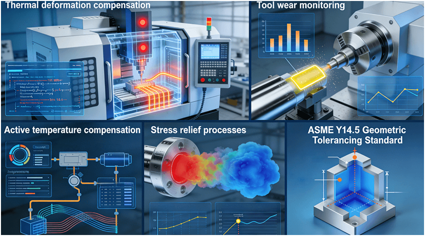 To achieve a tolerance on the micron order is a complex task due to mainly thermal deformation, tool wear, and material stress relief. This includes the variation in the workpiece size due to the heat produced from the high-speed machine spindle that can be well above 0.01mm, tool wear during machining of high-strength alloys.